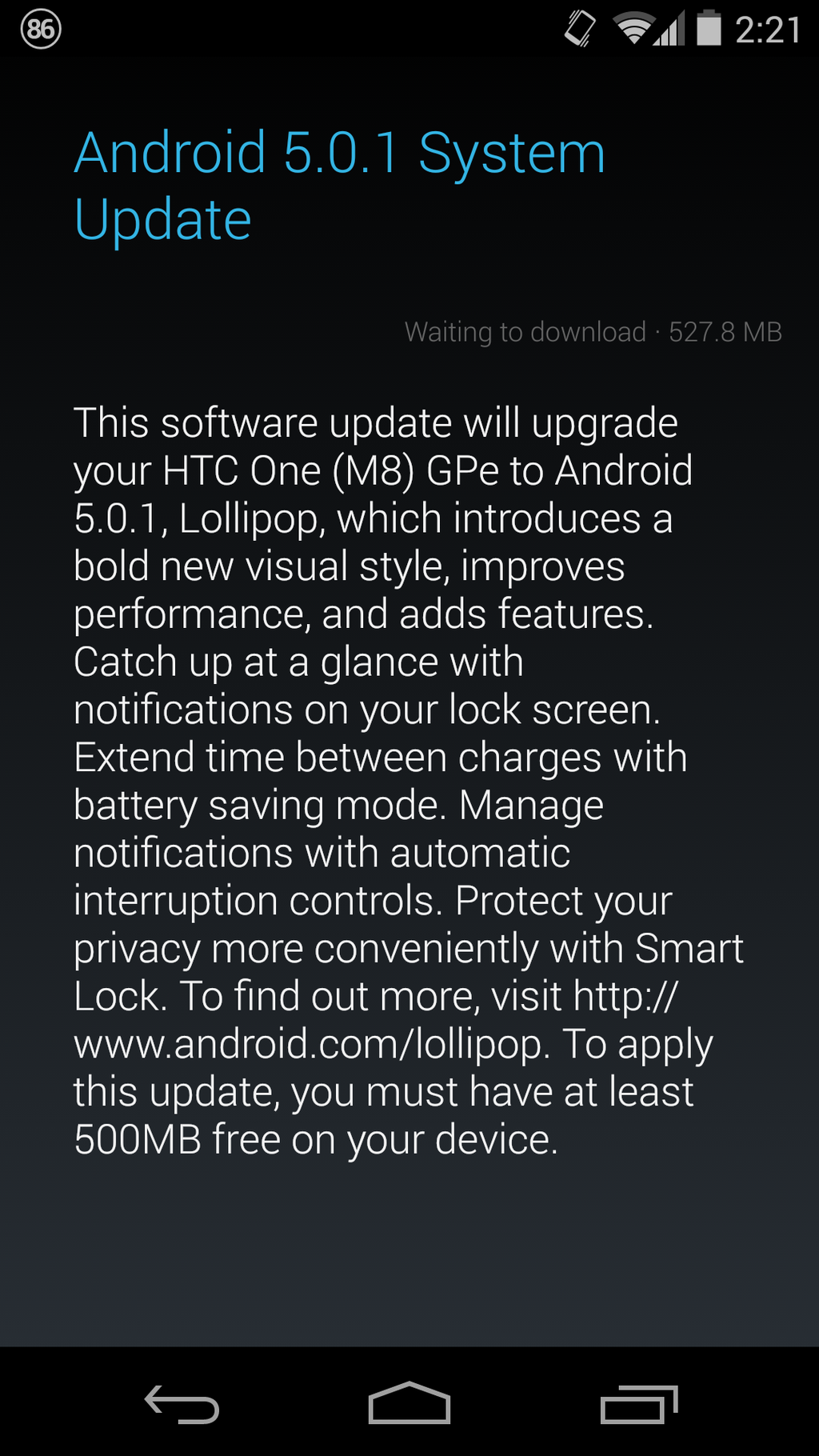 Wanneer de Android 5.0 Lollipop update moet uitkomen voor de normale HTC One (M7) of HTC One (M8) is nog onduidelijk, maar gezien de tijdslimiet van 90 dagen heeft het bedrijf nog tot eind januari.