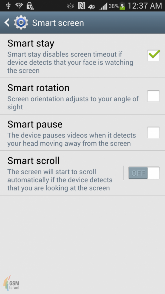 Naast de gebruikelijk functies komt de Galaxy S4 ook met een aantal zogeheten Smart functies. Enkele van deze zijn nieuw zoals Smart rotation en Smart scroll. De rest van de functies kun je in de onderstaande screenshots zien.
