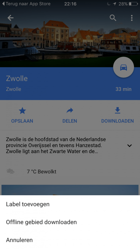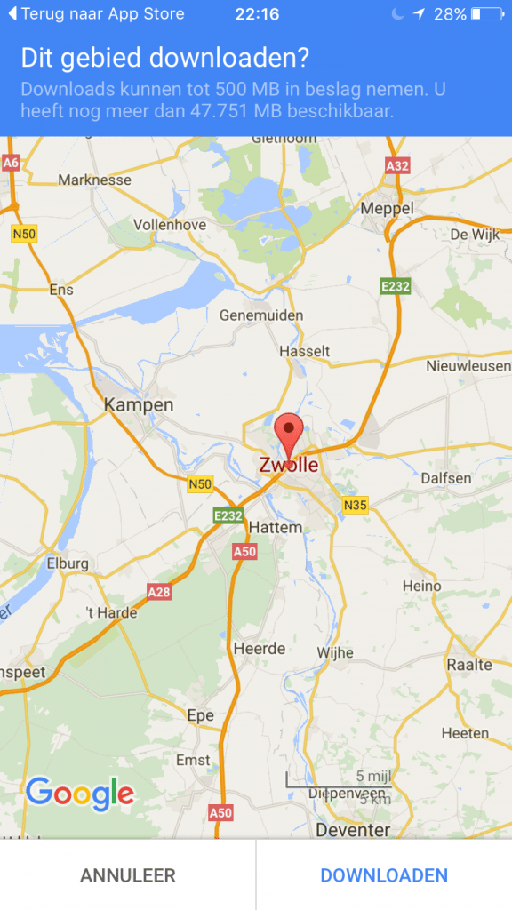 Google Maps voor iOS heeft vandaag een update ontvangen die enkele features introduceert die al sinds november beschikbaar zijn voor Android. De belangrijkste verbetering is dat kaarten door de gebruiker nu offline kunnen worden opgeslagen. De offline modus doet ditmaal echter meer dan alleen het downloaden van de wegen, want je kan ook naar locaties zoeken zonder dataverbinding, inclusief navigeren en het bekijken van openingstijden en contactinformatie.