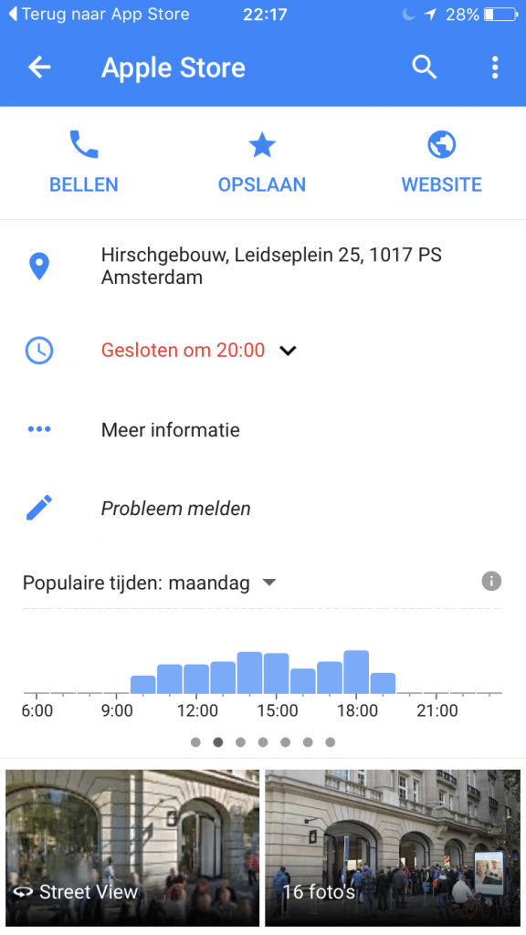 Verder is het in Google Maps voor iOS mogelijk om te zien op welke tijden je het best een winkel, museum, restaurant of ander point-of-interest kan bezoeken. Overigens is deze optie nog niet geactiveerd voor alle locaties, maar bij de belangrijkste plekken al wel, zoals bijvoorbeeld de Apple Store. Het bekijken van de populaire tijden doe je door te zoeken naar een locatie, waarna je het adres, contactinformatie, openingstijden en de populaire tijden krijgt te zien. De tijden kunnen per dag worden bekeken door te scrollen over de grafiek of het dropdown-menu te gebruiken.