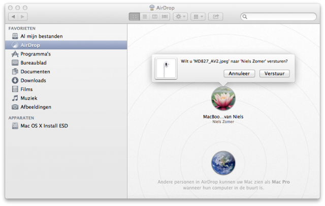 3. Wacht dat de andere Mac verschijnt, en sleep het bestand naar het venster om de bestand te versturen.