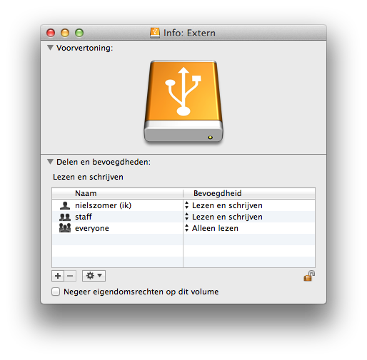 Nu de schijf is geformatteerd open je Finder in OS X, gebruik de toetscombinatie CMD-N om een nieuw Finder venster te openen, en selecteer de nieuwe schijf in het menu in de kolom links en de CMD-I. Controleer aan de onderkant van het informatie venster dat de optie “Negeer eigendomsrechten op dit volume” niet is ingeschakeld.