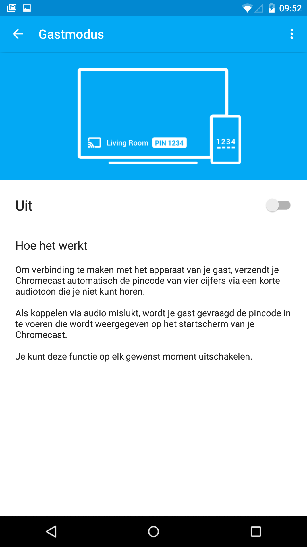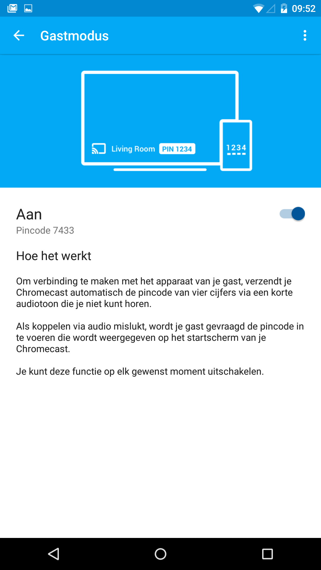 Gastmodus maakt het mogelijk om content naar de Chromecast te casten zonder dat je met hetzelfde WiFi moet zijn verbonden. Om een verbinding op te zetten wordt er gebruik gemaakt van de locatie van je Chromecast en het WiFi bereik om apparaten te identificeren. Tijdens het koppelen van beide producten verzendt de Chromecast automatisch een pincode naar je product door middel van een audiotoon die niet door het menselijk oor kan worden opgevangen. Mocht dit proces mislukken, dan wordt de gast gevraagd om een pincode in te voeren die wordt weergegeven op het startscherm van de Chromecast (televisie).