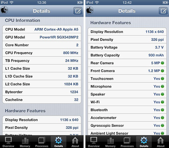 De Apple A5 van de nieuwe iPod Touch is dezelfde CPU en GPU als de A5 die vorig jaar werd gebruikt voor de iPhone 4S. Verder is er 512MB geheugen aanwezig, een 5 megapixel camera aan de achterkant, vergelijkbaar met de camera die momenteel achterop de iPad 3 te vinden. Wij verwachten dan ook dat de prestaties van de iPod Touch 5G identiek zal zijn aan de iPhone 4S.
