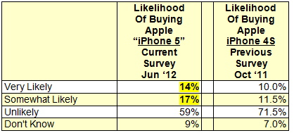 Het onderzoek van ChangeWave laat zien dat 14 procent van de ondervraagden heeft aangegeven ‘zeer waarschijnlijk’ een iPhone 5 te gaan kopen, terwijl 17 procent er ‘waarschijnlijk’ één gaat aanschaffen. De vraag naar de nieuwe iPhone is een stuk hoger in vergelijking met de vorige iPhone versies.