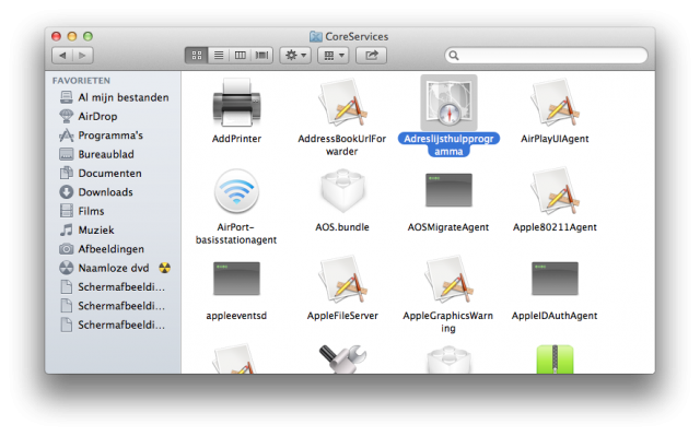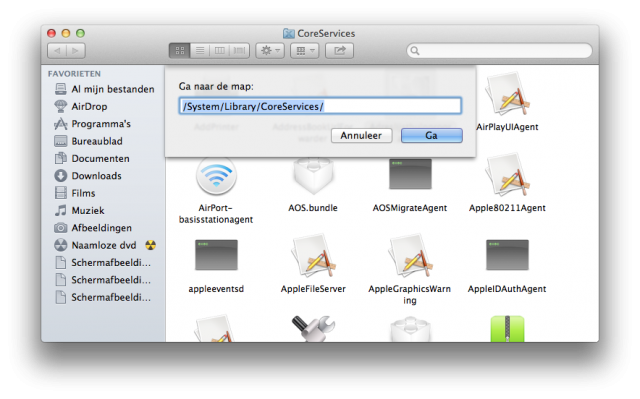 Open de Finder applicatie en gebruik de volgende toetsencombinatie -> command + shift + g en voor de volgende map in: /System/Library/CoreServices/