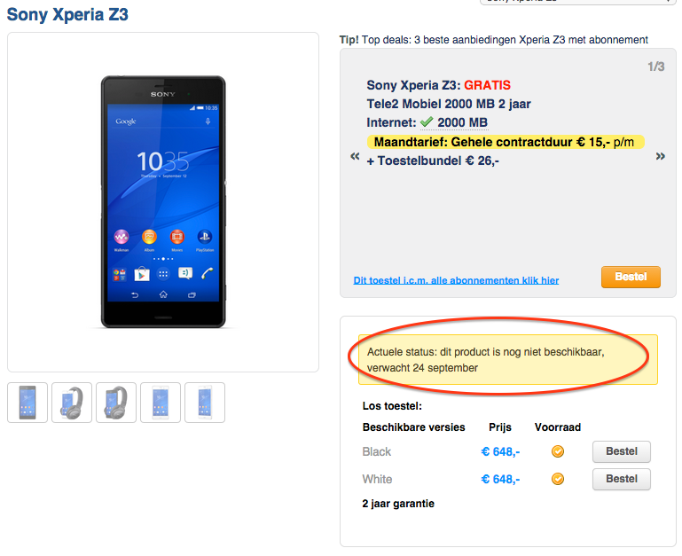 De Sony Xperia Z3 en Sony Xperia Z3 Compact werden beide vandaag aangekondigd tijdens de officiële IFA presentatie in Berlijn. Tijdens de aankondiging was het vrij onduidelijk wanneer beide modellen nou zijn te verkrijgen, maar een beetje speuren heeft ons geleerd dat beide modellen vanaf 24 september leverbaar zullen zijn. De websites BelSimpel en StudentMobiel denken de telefoon over drie weken te kunnen leveren. Op moment van schrijven kost de Sony Xperia Z3 649 euro, terwijl de Sony Xperia Z3 Compact een prijs van 499 euro heeft gekregen.