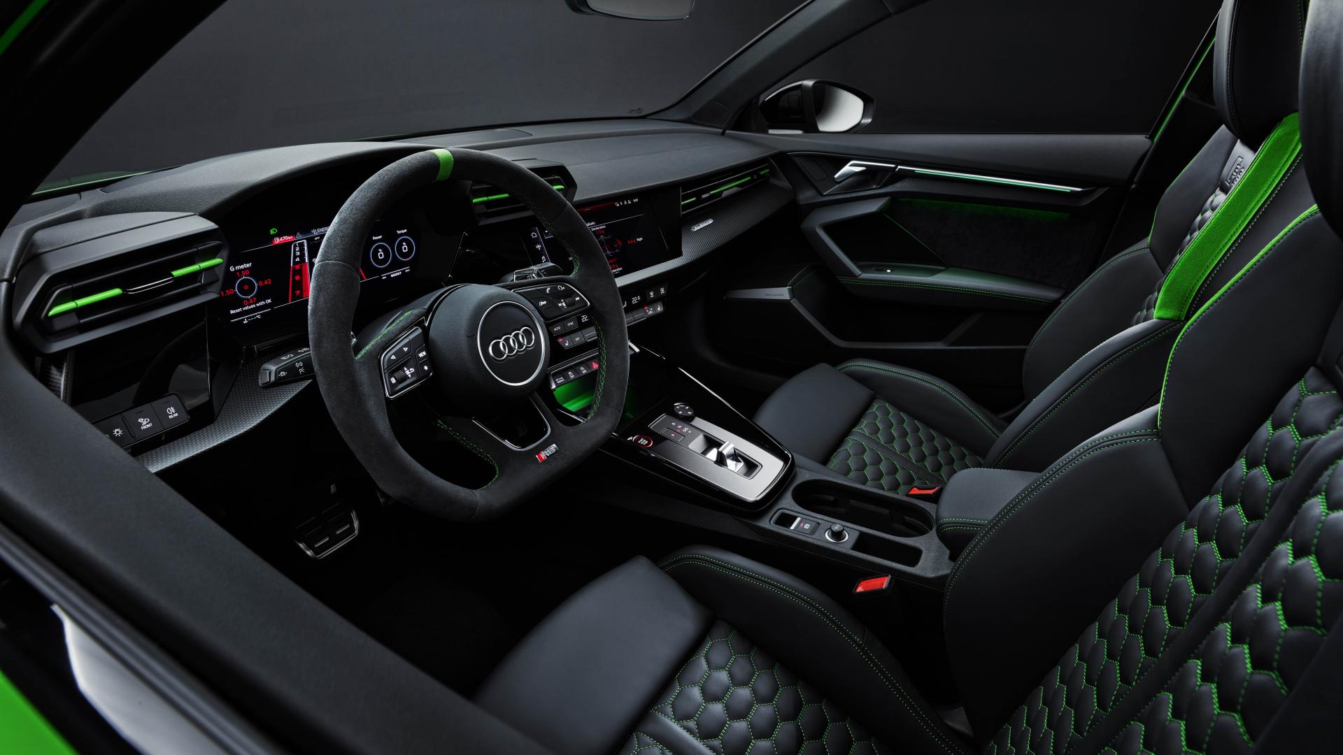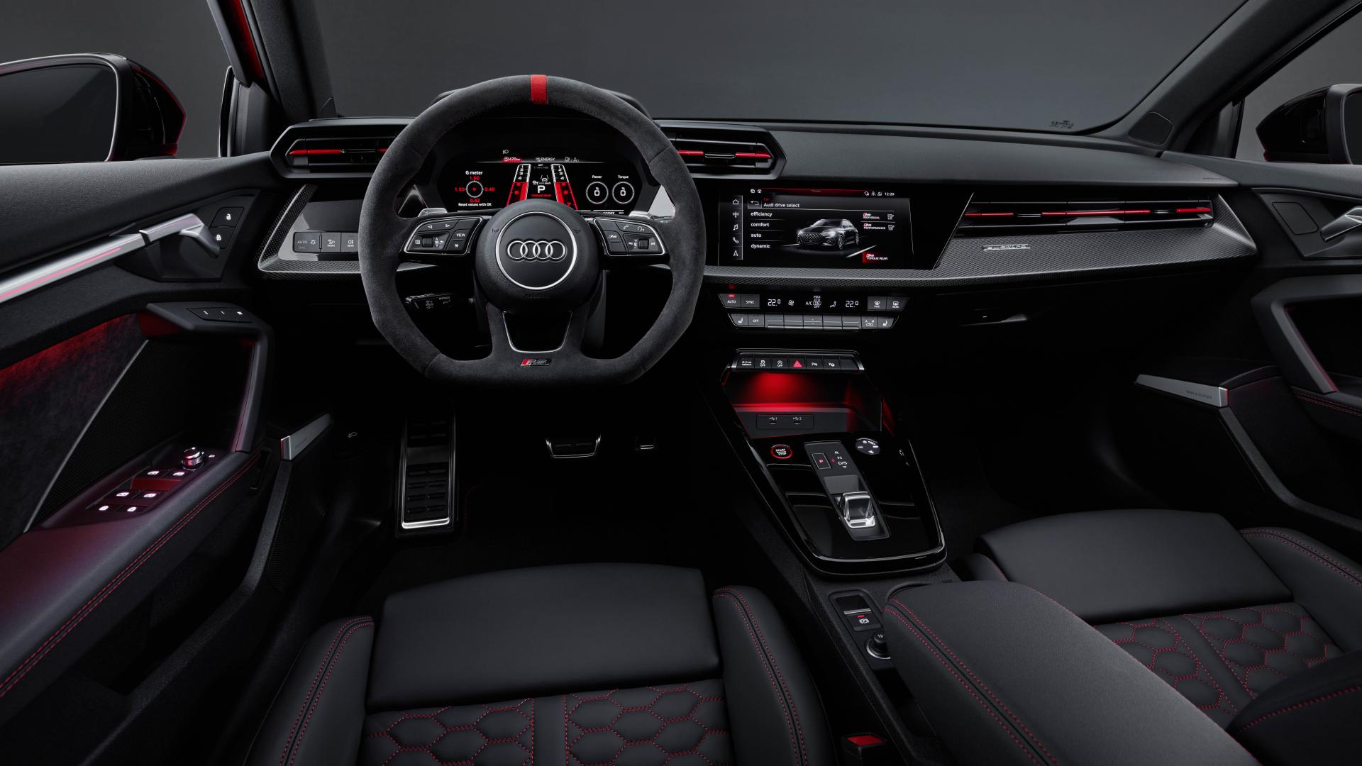 In het centrale 10,1 inch scherm is de RS Monitor opgenomen. Deze laat naast de temperatuur van koelvloeistof en (transmissie)olie ook de bandenspanning zien. Voor het eerst is de Audi RS 3 ook leverbaar met een head-up display. Het racegevoel in het interieur wordt verder versterkt doordat het dashboard van carbon is en door de RS-sportstoelen. Optioneel is fijnnappalederen bekleding met stiksels in RS-honingraatdesign beschikbaar. Ook voor het interieur zijn er vele individualiseringsmogelijkheden.