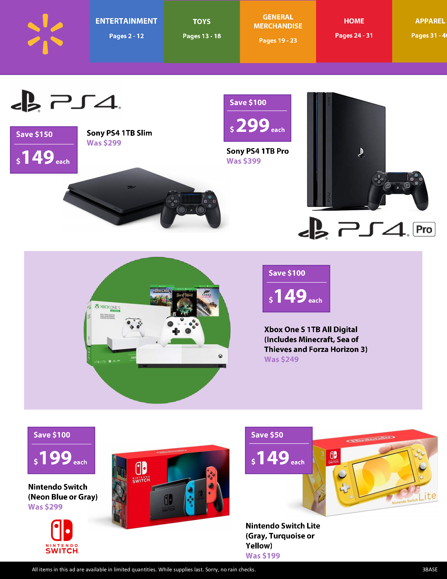 In de Verenigde Staten zal de PlayStation 4 (1TB) voor 149 dollar worden aangeboden, terwijl de PlayStation 4 Pro een prijskaartje krijgt van 299 dollar. De reguliere Nintendo Switch gaat slechts 199 dollar kosten en de Switch Lite wordt afgeprijsd naar 149 dollar. De Xbox One S 1TB All Digital Edition is in de folder te zien voor 149 dollar. De genoemde prijzen zijn nog zonder de lokale verkoopbelasting.