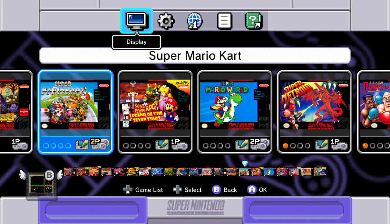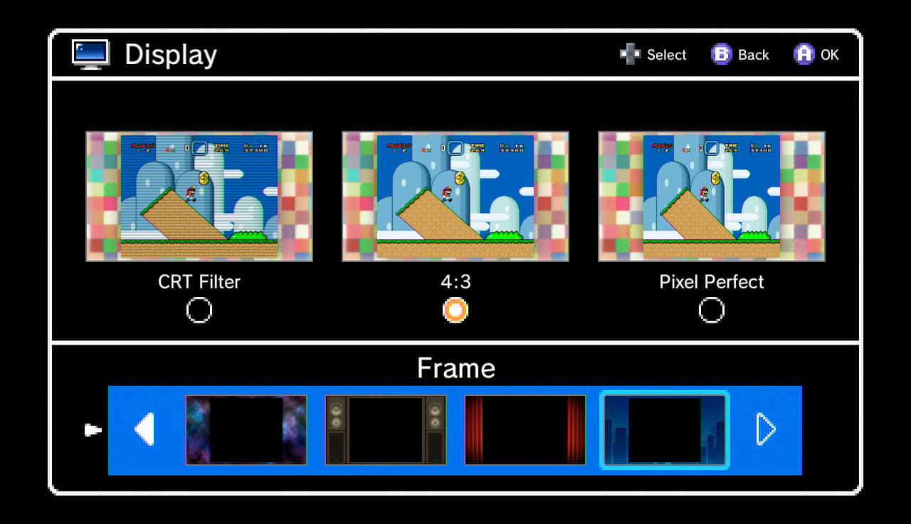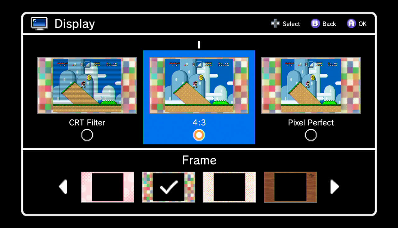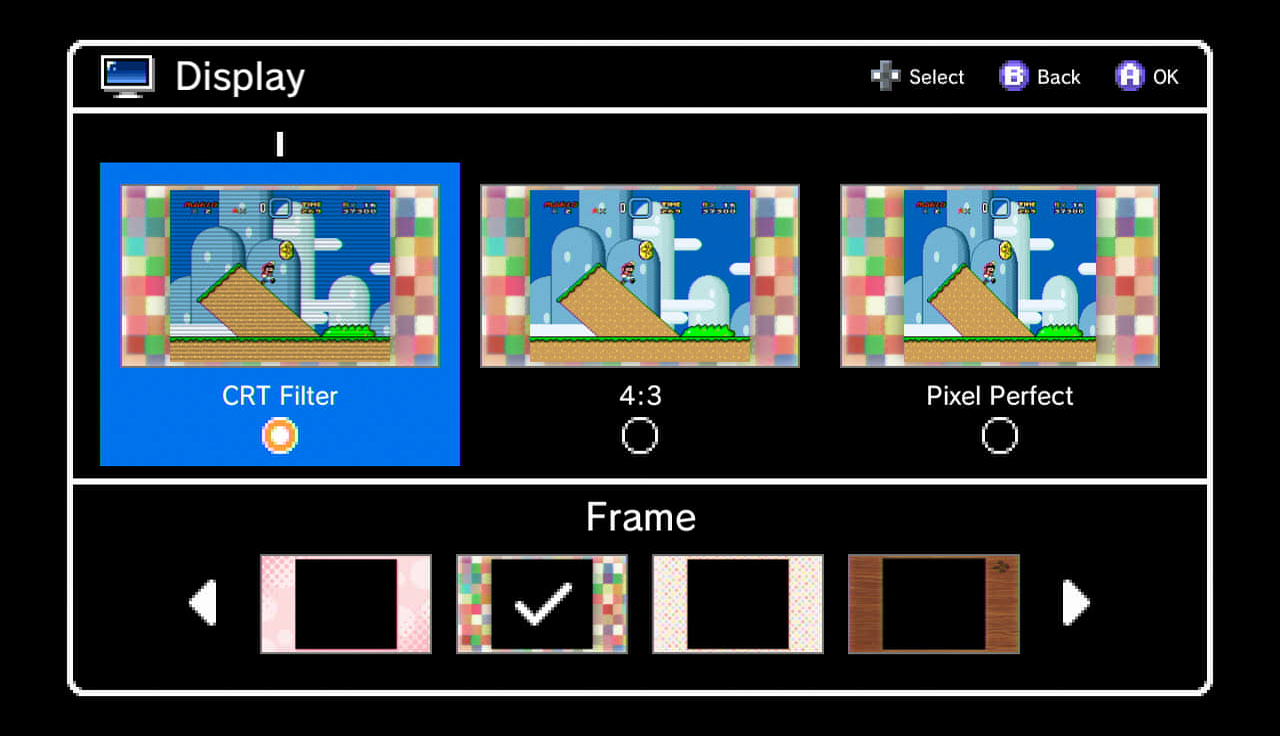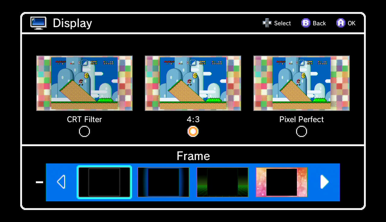 In het hoofdmenu van de Nintendo Classic Mini: SNES zijn er verder drie verschillende weergaveopties beschikbaar: een met een beeldverhouding van 4:3, een CRT-filter met scanlines en een modus die alle pixels perfect op het scherm weergeeft. Gamers kunnen er bovendien ook kiezen voor een optie om de omliggende gebieden van het scherm op te vullen met verschillende frames.