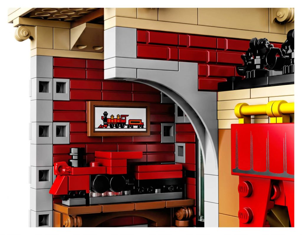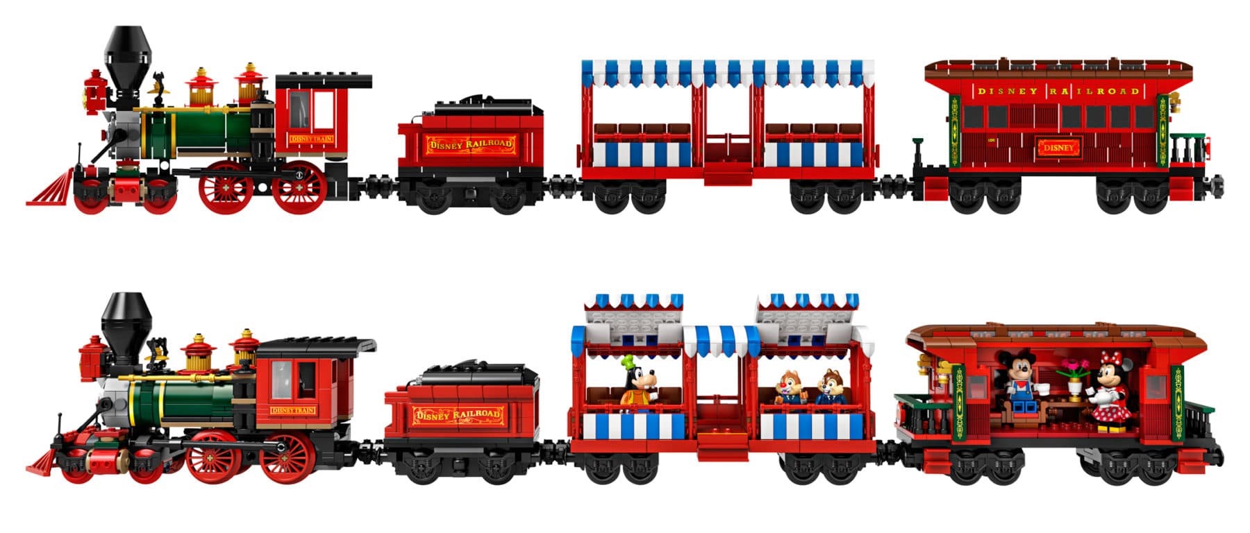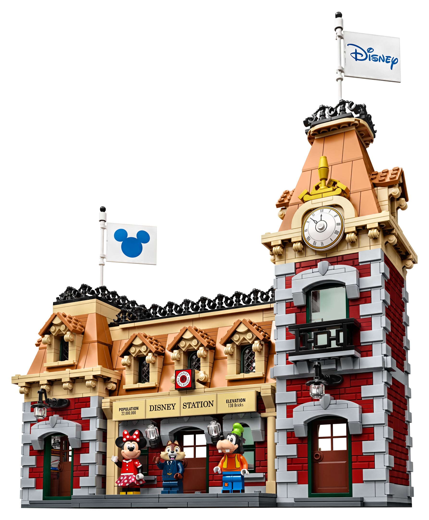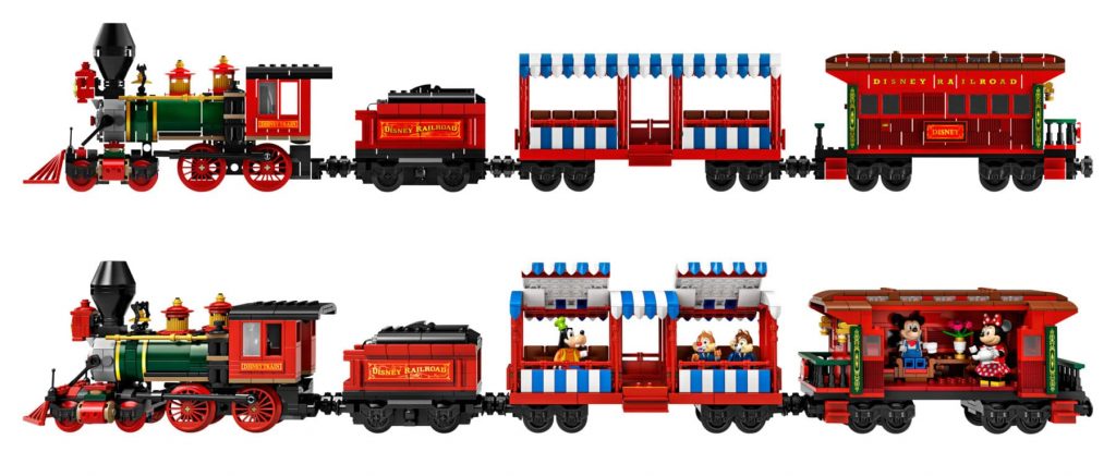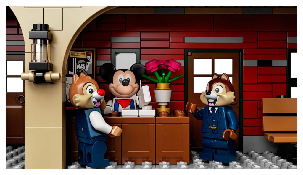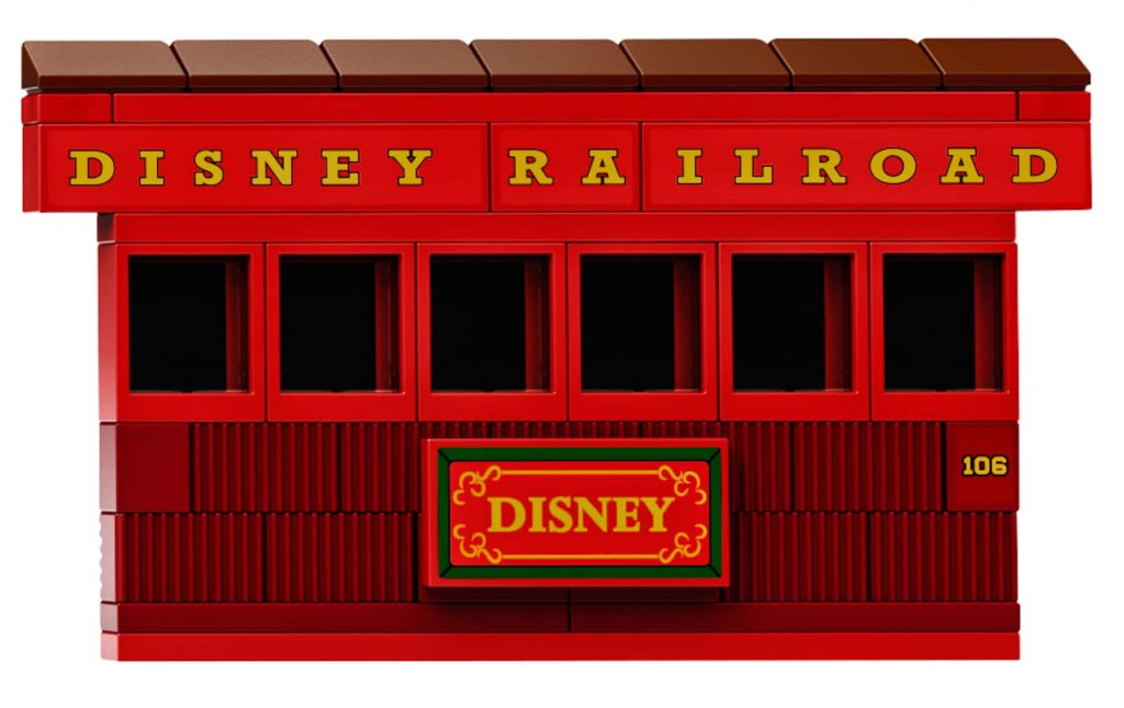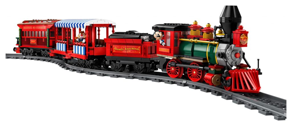 Disney trein en station omvat 16 gebogen en 4 rechte rails (de ovale spoorbaan is circa 96 cm lang en 70 cm breed), een locomotief, een tender, een personenwagon, een restauratiewagon en een prachtig stationsgebouw. De locomotief en geluidseffecten kunnen worden bediend met de LEGO Powered Up-app, die beschikbaar is voor smartphones draaiend op iOS of Android. De LEGO Powered Up 88009 Hub en LEGO Powered Up 88011 Treinmotor worden meegeleverd (batterijen zijn niet inbegrepen).