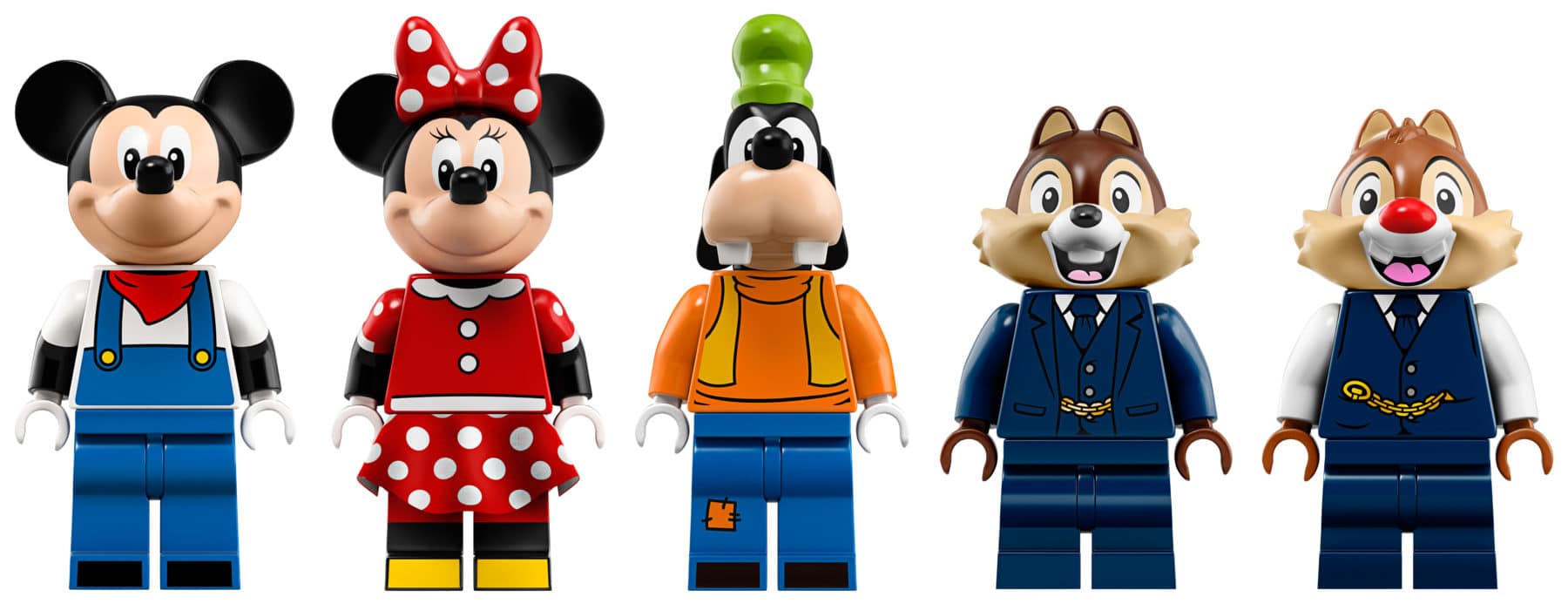 Ten slotte vinden we in de doos van LEGO Disney 71044 Disney Train & Station vijf minifiguren met unieke decoratie en accessoires: Mickey Mouse, Minnie Mouse, Knabbel, Babbel en Goofy.