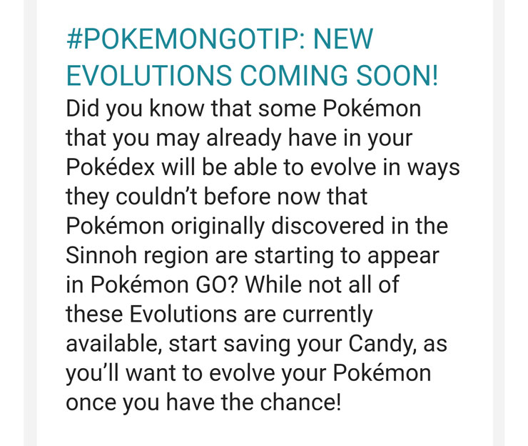 “Wist je dat sommige Pokémon die je mogelijk al in je Pokédex hebt op nieuwe manieren kan evolueren nu Pokémon die oorspronkelijk zijn ontdekt in de Sinnoh-regio beginnen te verschijnen in Pokémon Go? Nog niet alle evoluties zijn op dit moment beschikbaar, maar het is verstandig om je Candy op te sparen, zodat je je Pokémon kan evolueren wanneer je de kans krijgt.”