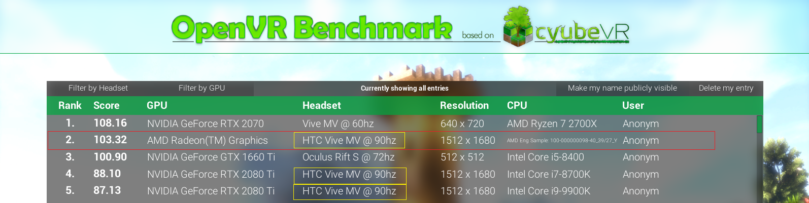 De vooralsnog onbekende AMD-gpu werd getest met een HTC Vive MV (90Hz) HMD (1512 x 1680 pixels) en weet 103,32 frames per seconde te scoren, terwijl de GeForce RTX 2080 Ti met dezelfde resolutie ‘slechts’ 88,10 fps weet te behalen. Dat is een verschil van 17 procent in het voordeel van AMD. In het overzicht worden ook de RTX 2070 en GTX 1660 Ti meegenomen, echter zijn die benchmarks uitgevoerd op lagere resoluties.