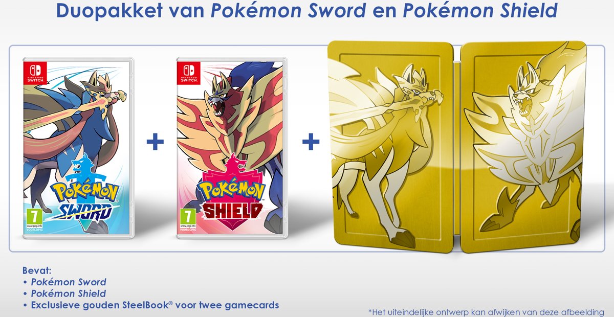 Pokémon Sword en Shield worden op 15 november uitgebracht. Nintendo brengt daarnaast een bundel uit met beide games en een exclusieve gouden SteelBook voor twee gamecards. Het duopakket wordt in beperkte oplage uitgebracht en is alleen bij Game Mania (€129,-) nog beschikbaar voor pre-order.