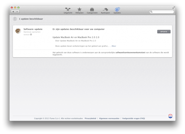 Voor iedereen die in bezit is van een nieuwe MacBook Air of MacBook Pro die beide in juni van dit jaar werden uitgebracht, Apple heeft zojuist een software update beschikbaar gesteld. De update is 127MB groot en lost enkele bugs op, verbetert de grafische prestaties van je systeem, en zorgt voor betere ondersteuning met enkele USB apparaten.