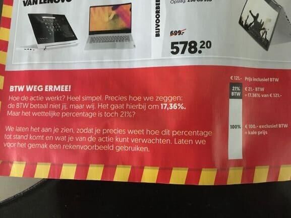 Dat klopt, je ontvangt namelijk een effectieve korting van 17,36%. Stel: een tv kost € 1210,- inclusief btw, dan wordt de actieprijs als volgt berekend: € 1210,- x (100/121) = € 1000,- exclusief btw. Jouw btw-voordeel is dus € 210,- oftewel 17,36%. De wettelijke thuiskopieheffing en BTW blijven gehandhaafd, dus ook op aankopen gekocht tijdens deze actie. Je kan daarom ook nog steeds op naam van jouw bedrijf artikelen kopen tijdens de btw-actie.