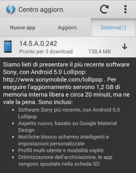 De nieuwe groep Xperia toestellen die de Android 5.0 Lollipop update in de komende periode kunnen verwachten zijn de Xperia Z1, Xperia Z1 Compact, Xperia Z3 Dual en de Xperia Z Ultra. Op de afbeelding zie je een update notificatie van een Italiaanse Xperia Z1 Compact gebruiker.