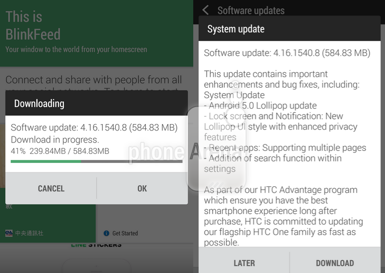 Kort na de introductie van Android 5.0 Lollipop tijdens het Google I/O evenement in 2014, maakte HTC bekend dat het de One M7 en One M8 binnen 90 dagen na het vrijgeven van de definitieve versie worden geüpdatet naar Android 5.0. Het nieuwe besturingssysteem brengt betere beveiliging, snellere prestaties en een moderner ontwerp dankzij het door Google geïntroduceerde Material Design. De update moet nu nog zijn weg vinden naar Europa.