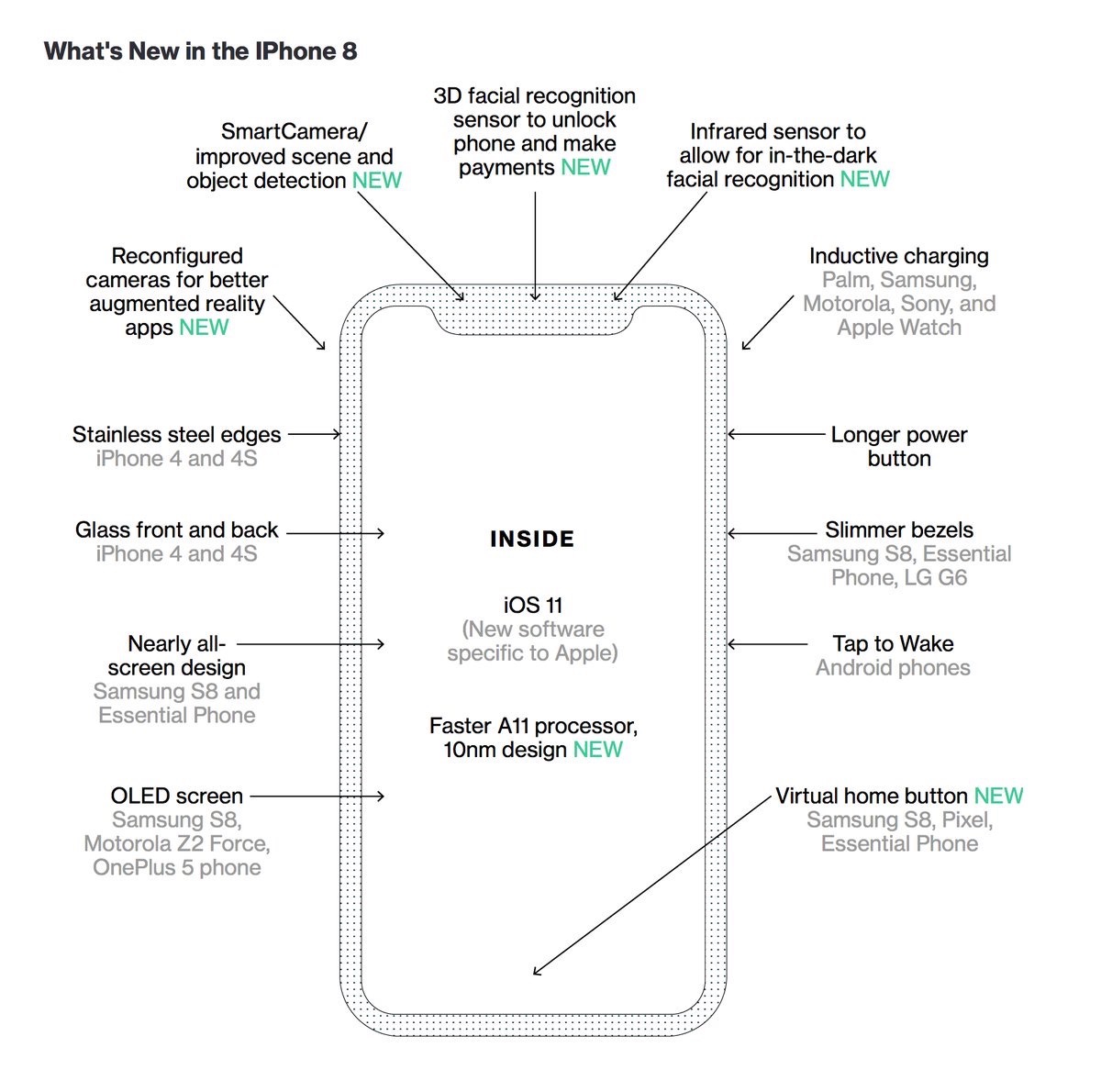 Op basis van andere details die zijn opgedoken in de HomePod-firmware van Apple, blijkt dat de iPhone 8 een strook boven het scherm krijgt, die de sensoren en de camera zal huisvesten. De nieuwe iPhones worden in drie kleuren aangeboden: zwart, zilver en Blush Gold (koperachtige optie). Het is aannemelijk dat de iPhone 8 in de eerste twee weken van september door Apple wordt aangekondigd, mogelijk samen met de iPhone 7s-serie en Apple Watch Series 3. De lancering zal vermoedelijk in de tweede helft van september plaatsvinden.