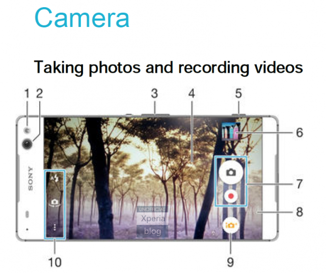 In de handleiding van de Sony Xperia C5 Ultra is ook de volledige bediening van het toestel te zien en de externe hardware features. Aan de voorzijde vinden we een luidspreker en een selfie-camera met led-flitser met aan de zijkant een fysieke camera-knop, microSD kaartslot en een nano-simkaart slot. De volume knoppen kunnen daarnaast worden gebruikt om in of uit te zoomen in de camera-app.