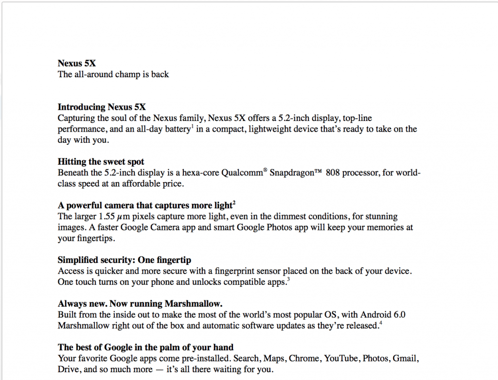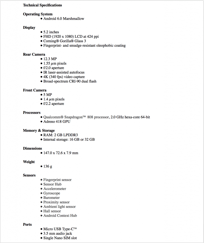 De Nexus 5X wordt morgen tijdens het Google evenement aangekondigd en voor de specificaties van het toestel hoeven we de presentatie in ieder geval niet te volgen, want zojuist is er een document verschenen die alle specificaties van de smartphone tonen. Veel twijfels waren er overigens al niet over de hardware, desondanks gaat het document wel wat dieper in op de eigenschappen van de camera en de verschillende features van de Nexus 5X.