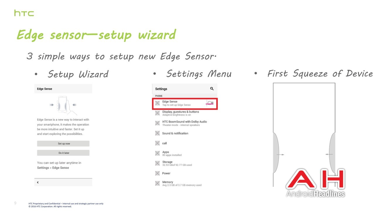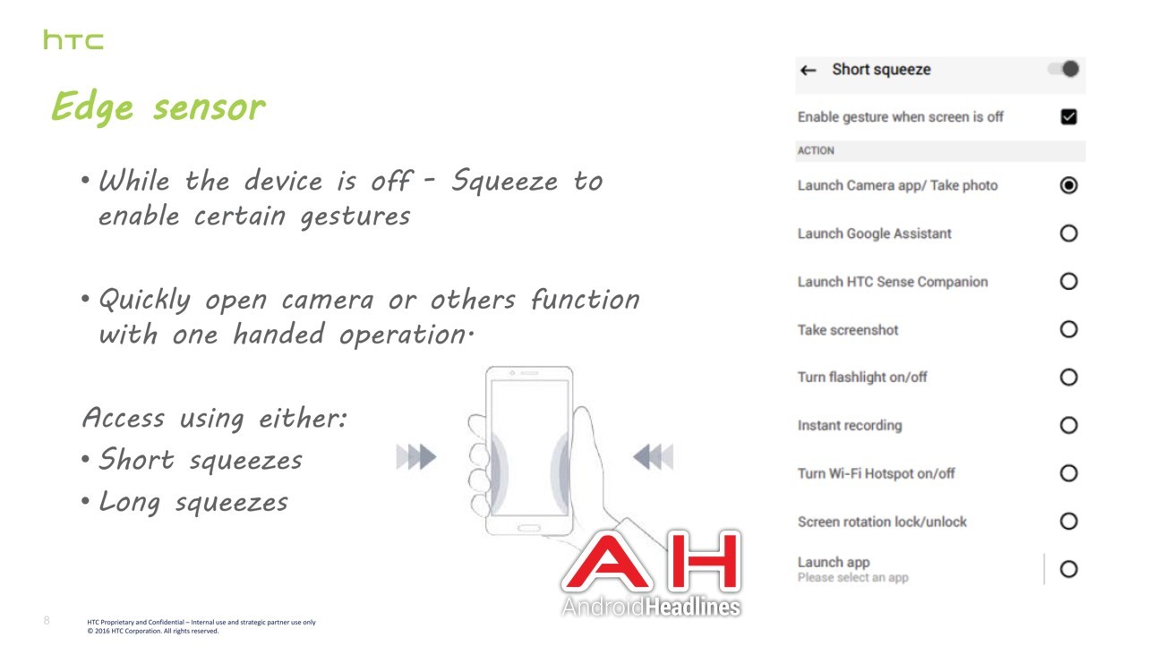 De video laat ook zien hoe de Edge Sense-functie op de HTC U 11 werkt. Gebruikers kunnen in de zijkanten van de behuizing knijpen om verschillende acties uit te voeren of applicaties te starten. Enkele dagen geleden verscheen de applicatie Edge Sense al kortstondig in de Play Store, maar het was nog onduidelijk welke configuraties HTC zal aanbieden. In de video zien we dat gebruikers kunnen kiezen uit verschillende niveaus. Er wordt een animatie weergegeven wanneer de gebruiker in het frame van de HTC U 11 knijpt. Edge Sense kan worden gebruikt om foto’s en video’s vast te leggen, maar ook kunnen gebruikers zelf acties creëren om bijvoorbeeld Google Assistant starten.