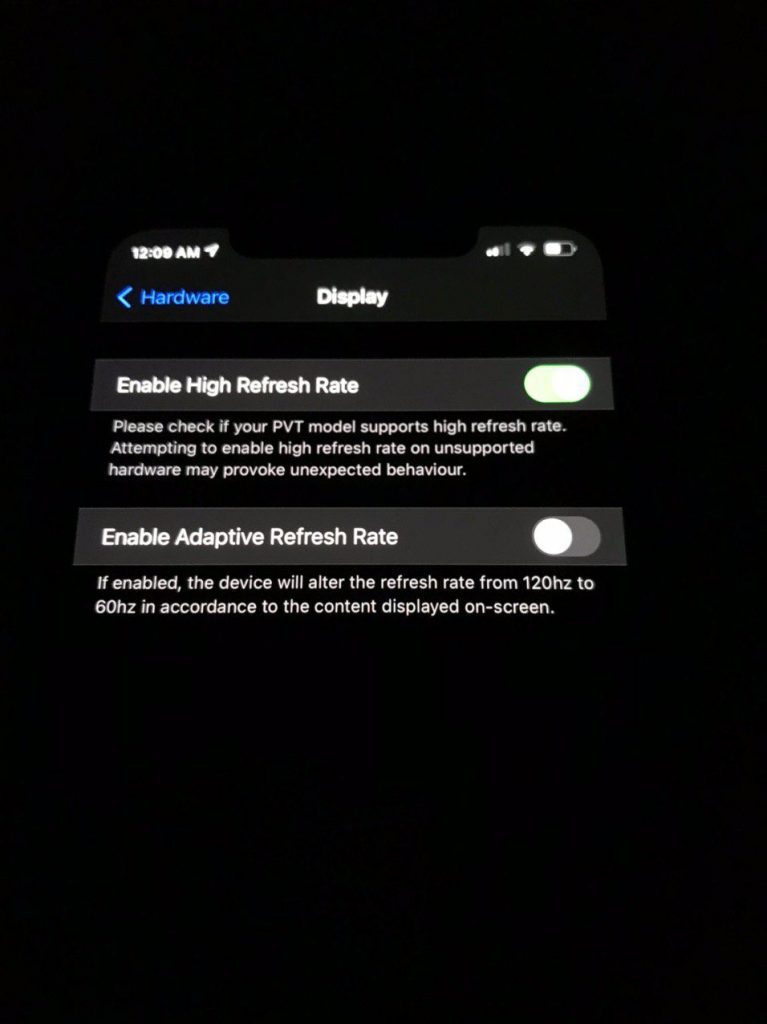 De beelden zijn gedeeld door insider Jon Prosser en bevestigen de geruchten dat Apple overweegt om de iPhone 12 Pro-serie te voorzien van een oledscherm met een verversingssnelheid van 120Hz. De instellingen tonen een optie voor het inschakelen van een hoge verversingssnelheid en een adaptieve modus, waarbij de verversingssnelheid continu wordt aangepast op basis van de content die op het scherm wordt weergegeven. Deze laatstgenoemde optie is er vermoedelijk om de accuduur van het toestel te verbeteren.