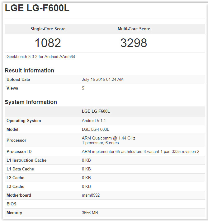 In de Geekbench database is namelijk een nieuwe LG smartphone te vinden met het modelnummer LG-F600L. Dit toestel is net als de LG G4 voorzien van een Snapdragon 808-soc van Qualcomm en dat zou in onze ogen een vreemde keuze zijn, vooral omdat de Huawei Nexus naar verluidt draait op de Snapdragon 820-soc, een processor die aanzienlijk sneller is. De Snapdragon 808-soc is voorzien van zes 64-bit cores, waarvan twee snelle Cortex-A57 cores en vier tragere Cortex-A53 cores in combinatie met een Adreno 418-gpu.