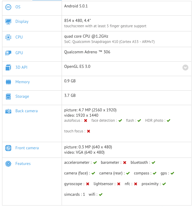 Aan de achterzijde vinden we een 4,7-megapixel camera met een maximale resolutie van 2560 x 1920 pixels. De camera is in staat om video’s op te nemen in 1080p, maar ontbeert autofocus. Selfies kunnen worden geschoten met de 0,3-megapixel camera aan de achterzijde, waarmee video’s in een resolutie van 640 x 480 pixels kunnen worden opgenomen.
