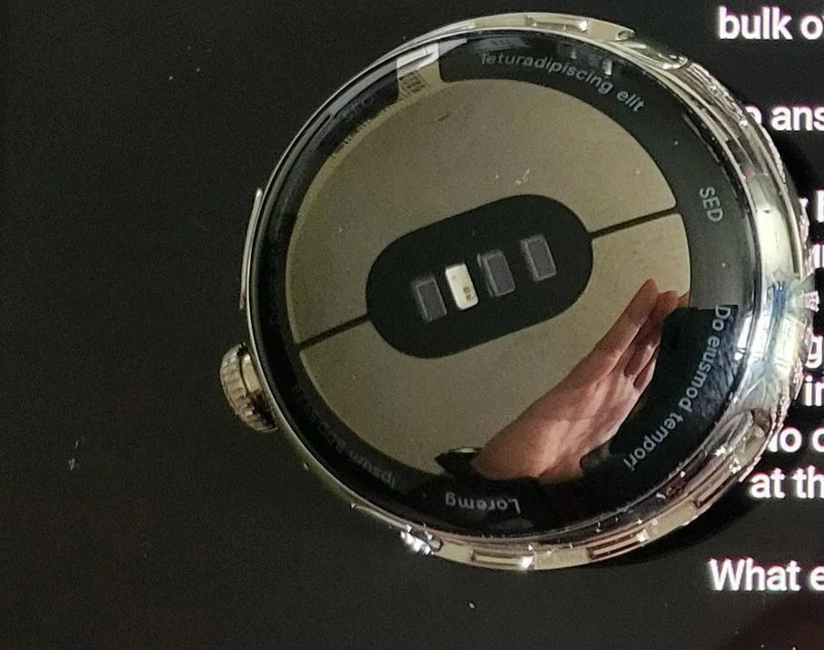 In de foto hierboven wordt de Pixel Watch vergeleken met een 40mm Apple Watch en een 46mm Galaxy Watch. De Google Pixel Watch is 40mm breed en 14mm dik. Het scherm is naar verluidt 30mm (zonder bezel) en het slimme horloge weegt 36g. Op de achterkant zien we Latijnse tekst en dit is vermoedelijk een placeholder tijdens de prototypefase.