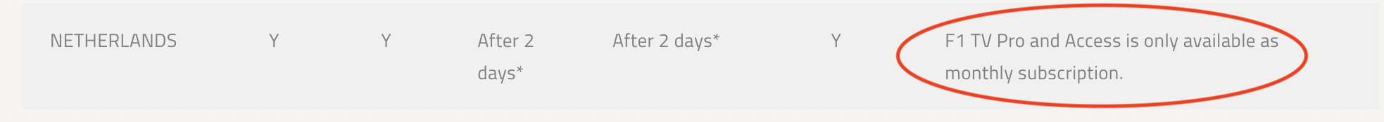 Vlak voor de aanvang van het nieuwe F1-seizoen werd aangekondigd dat F1 TV Pro in Nederland aanzienlijk duurder zal worden. Vandaag brengt echter nog meer slecht nieuws, aangezien het lijkt dat de streamingdienst gestopt is met het aanbieden van een jaarabonnement. Op het moment van schrijven zijn er slechts twee opties beschikbaar: F1 TV Pro voor €11,90 per maand of TV Access voor €3,99 per maand. Dit betekent dat het jaarlijkse tarief neerkomt op €142,80, terwijl eerder een jaarabonnement van €95 genoemd werd.